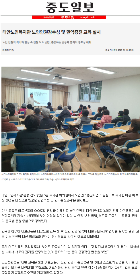 태안노인복지관 노인인권감수성 및 권익증진 교육 실시