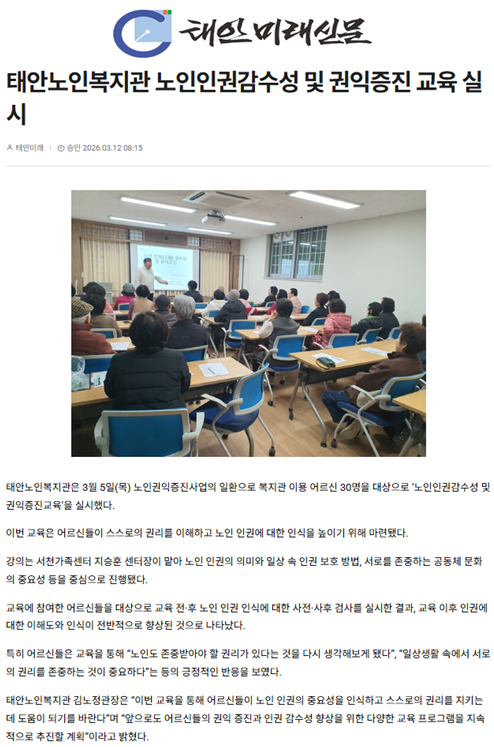 태안노인복지관 노인인권감수성 및 권익증진 교육 실시