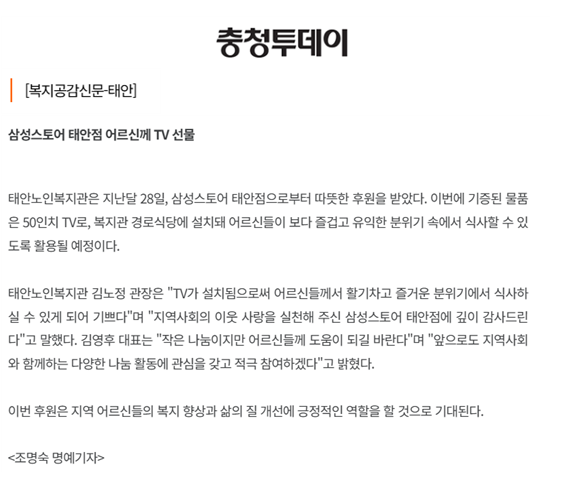 태안노인복지관, 삼성스토어 태안점 어르신께 TV 선물