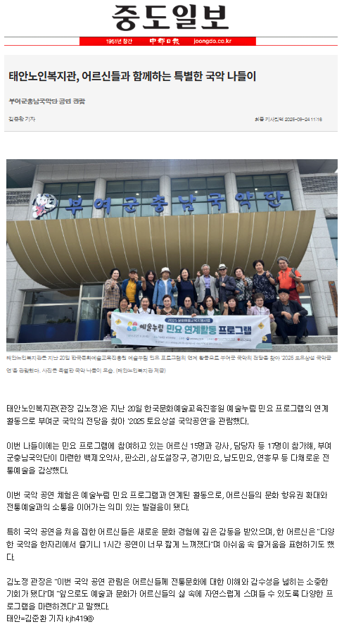 태안노인복지관, 어르신들과 함께하는 특별한 국악 나들이