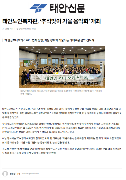- 다음글태안노인복지관, '추석맞이 가을 음악회' 개최 25.09.29
