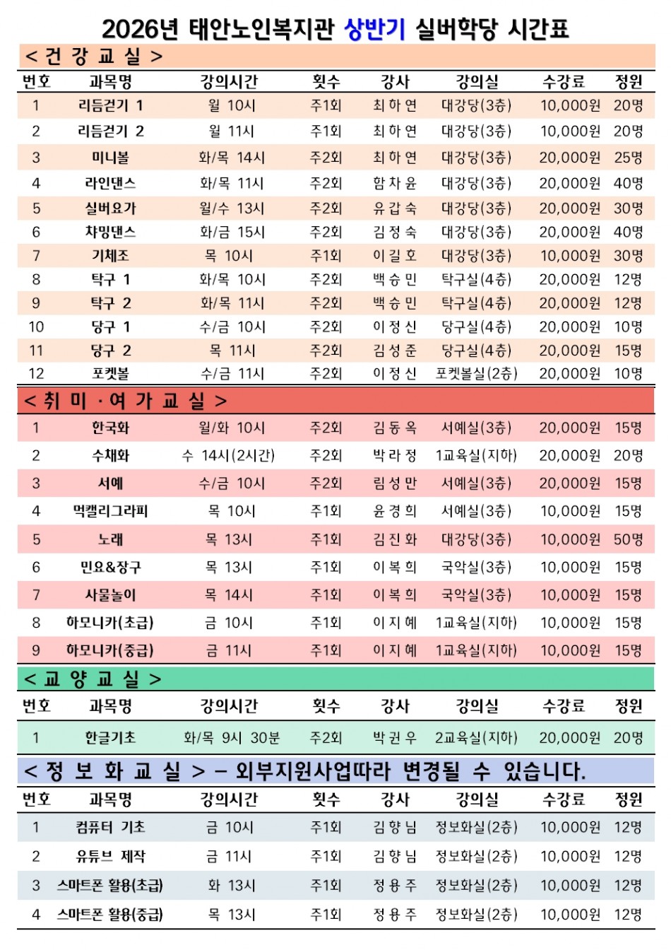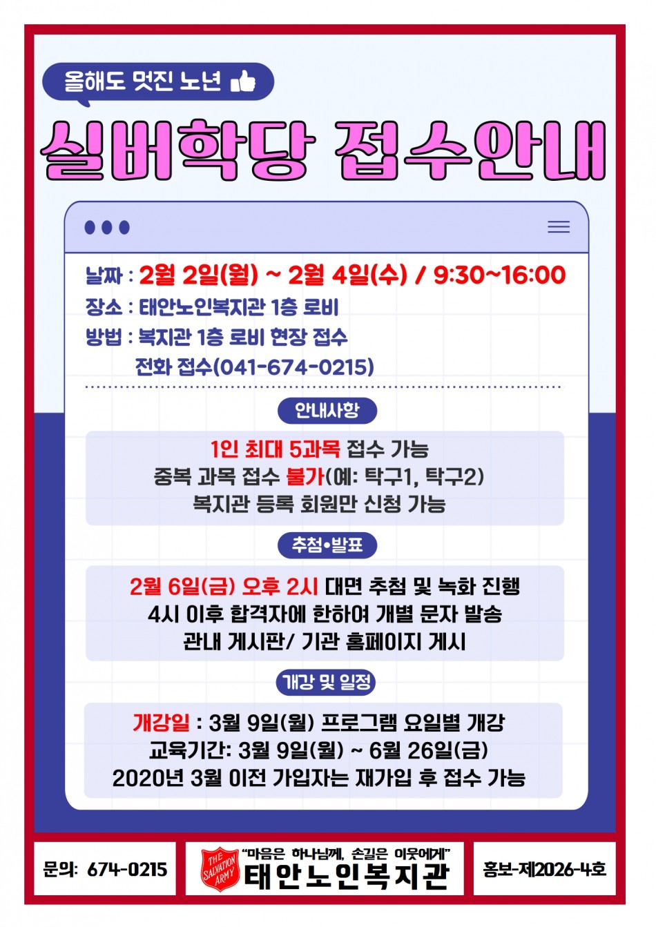 2026년 상반기 노년사회화교육사업(실버학당) 접수 안내 페이지 정보 작성자 태안노인복지관 댓글 0건 조회 68회 작성일 26-01-20 14:38 목록 본문 [태안노인복지관 2026년 상반기 실버학당 접수 안내] 다음글2026년 노인자원봉사단 모집 26.01.19 댓글 0 댓글목록 등록된 댓글이 없습니다.