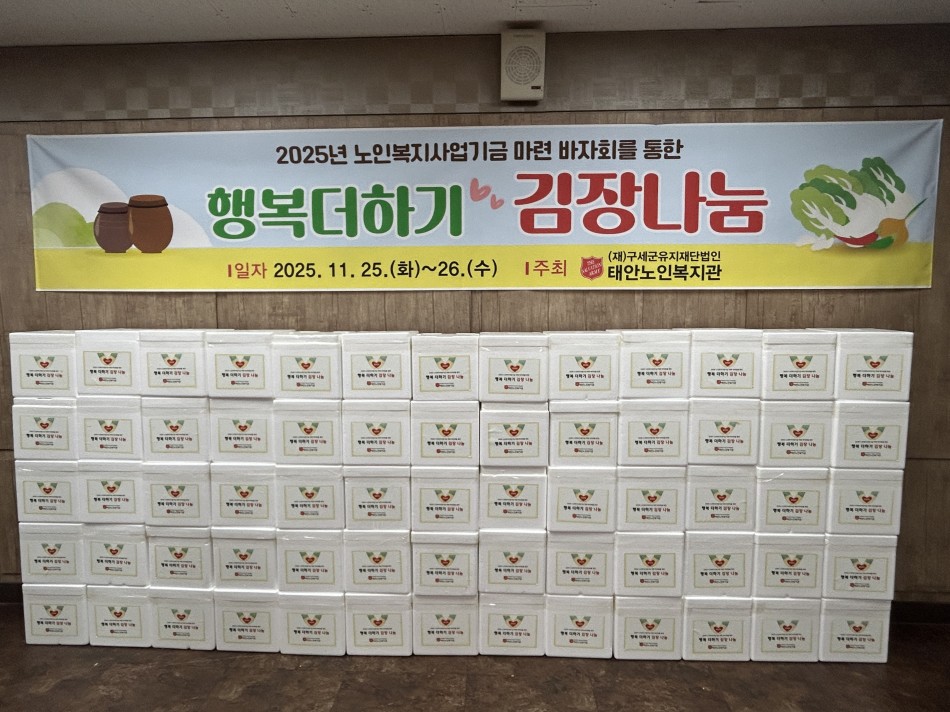 태안노인복지관은 11월 25일(화)부터 26일(수)까지 이틀간 2025년 노인복지사업기금 마련 바자회 수익금을 활용해 ‘행복더하기 김장 나눔 행사’를 진행하였습니다.