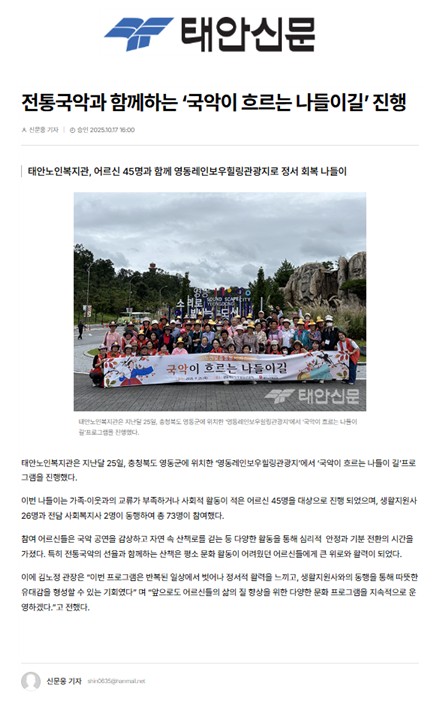 - 다음글태안노인복지관, 전통 국악과 함께하는 ‘국악이 흐르는 나들이 길’ 진행 25.11.03