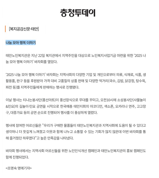 - 이전글태안노인복지관, 노인공익활동 참여자 직무·안전교육 실시 25.11.03