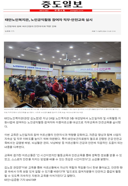 - 이전글태안노인복지관, 노인일자리 및 사회활동 지원사업 노인공익활동 참여자 직무‧안전교육 실시 25.11.03