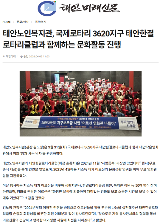 태안노인복지관, 국제로타리 3620지구 태안한결로타리클럽과 함께하는 문화활동 진행