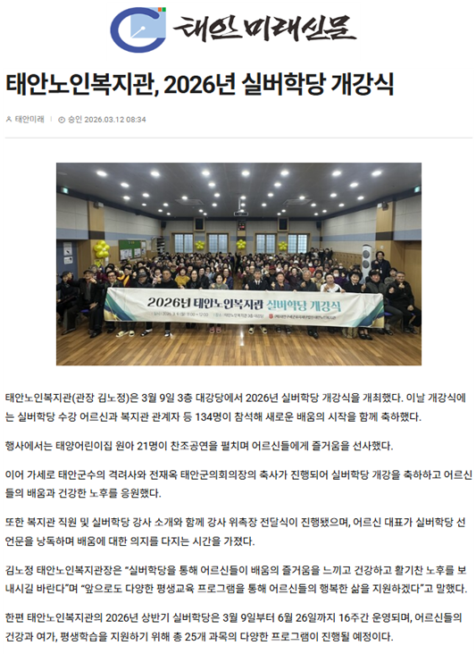 - 이전글태안노인복지관, 2026년 실버학당 개강 26.03.18