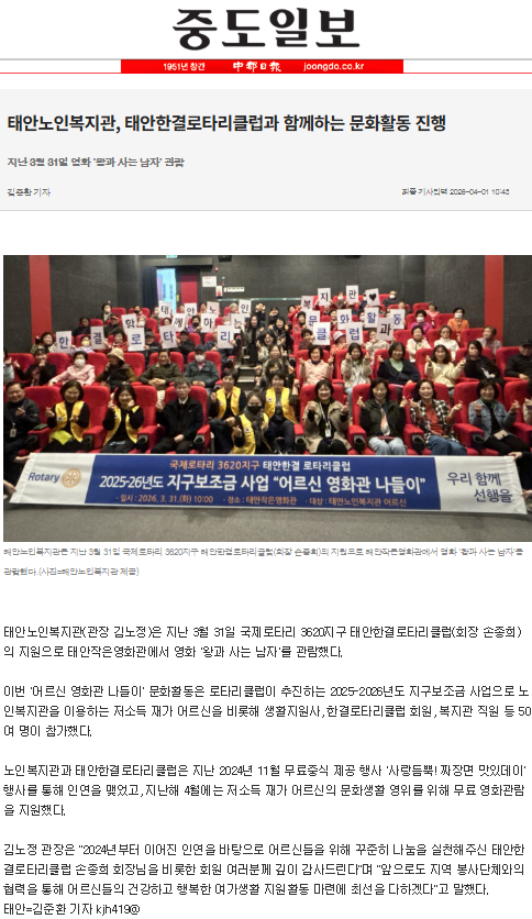 태안노인복지관, 태안한결로타리클럽과 함께하는 문화활동 진행 페이지 정보 작성자 태안노인복지관 댓글 0건 조회 11회 작성일 26-04-02 09:18 목록 본문 - 관련링크 https://www.joongdo.co.kr/web/view.php?key=20260401010000171 6회 연결 다음글태안노인복지관, ‘라탄 귤바구니 만들기’ 프로그램 운영 26.03.30 댓글 0 댓글목록 등록된 댓글이 없습니다.