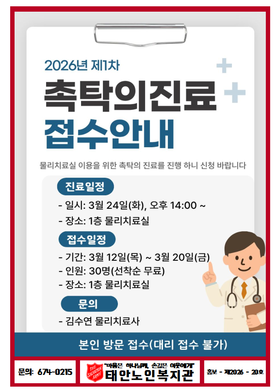 2026년 제1차 촉탁의 진료 접수안내 페이지 정보 작성자 태안노인복지관 댓글 0건 조회 33회 작성일 26-03-11 16:49 목록 본문 물리치료실 이용을 위한 촉탁의 진료를 진행 하니 많은 신청 바랍니다 다음글2026년 실버학당 개강식 안내 26.02.25 댓글 0 댓글목록 등록된 댓글이 없습니다.