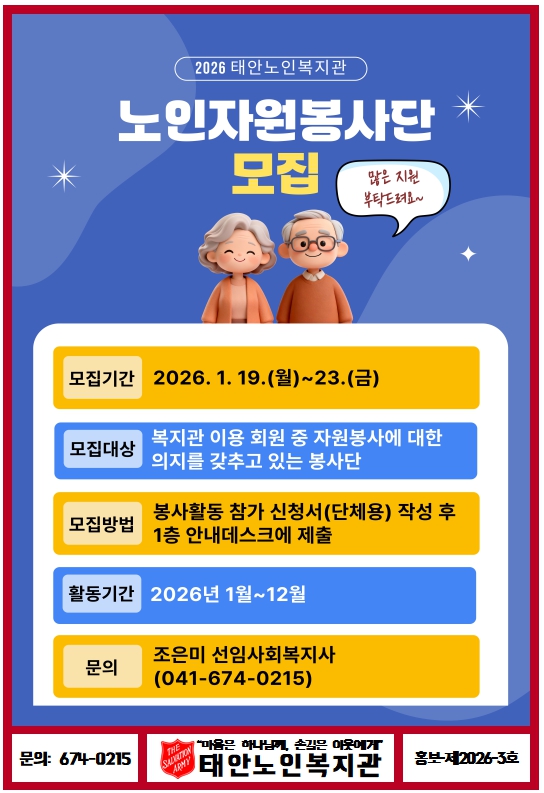 2026년 노인자원봉사단을 모집하오니 많은 관심 부탁드립니다.