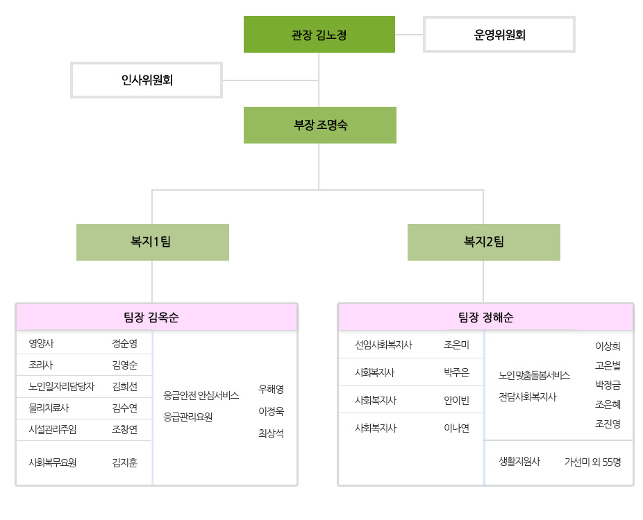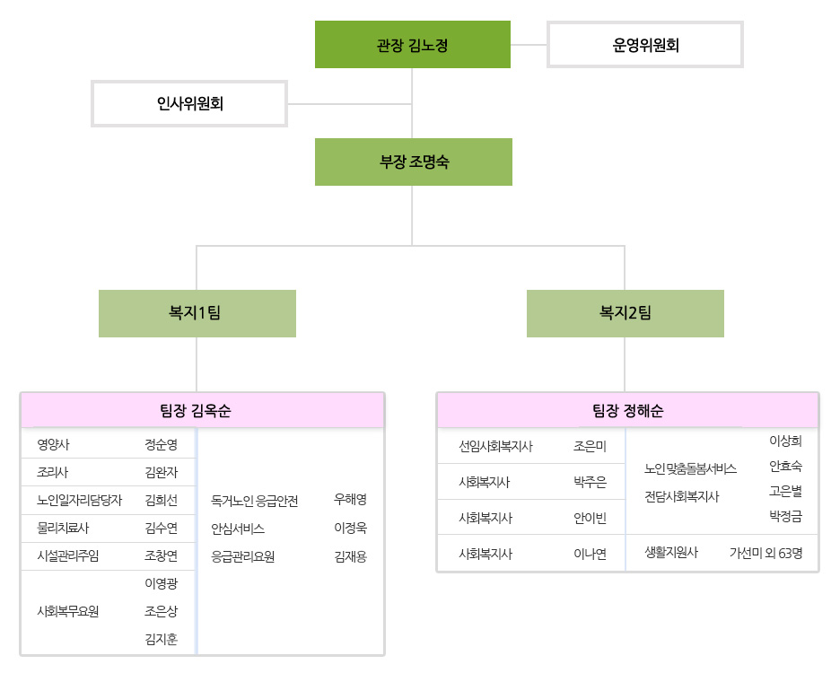 | 구분 | 관장 | 부장 | 팀장 | 선임사회 복지사 |